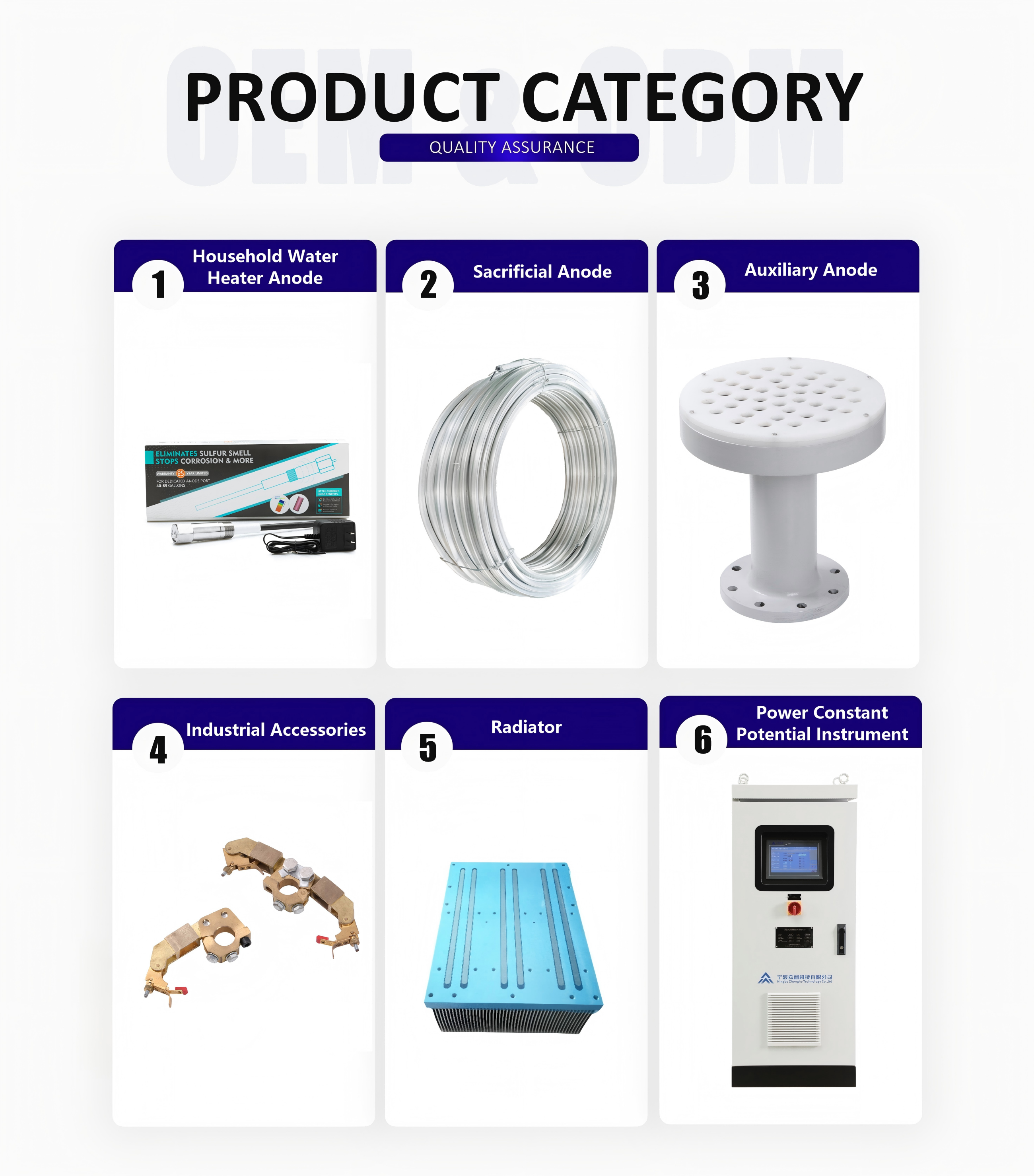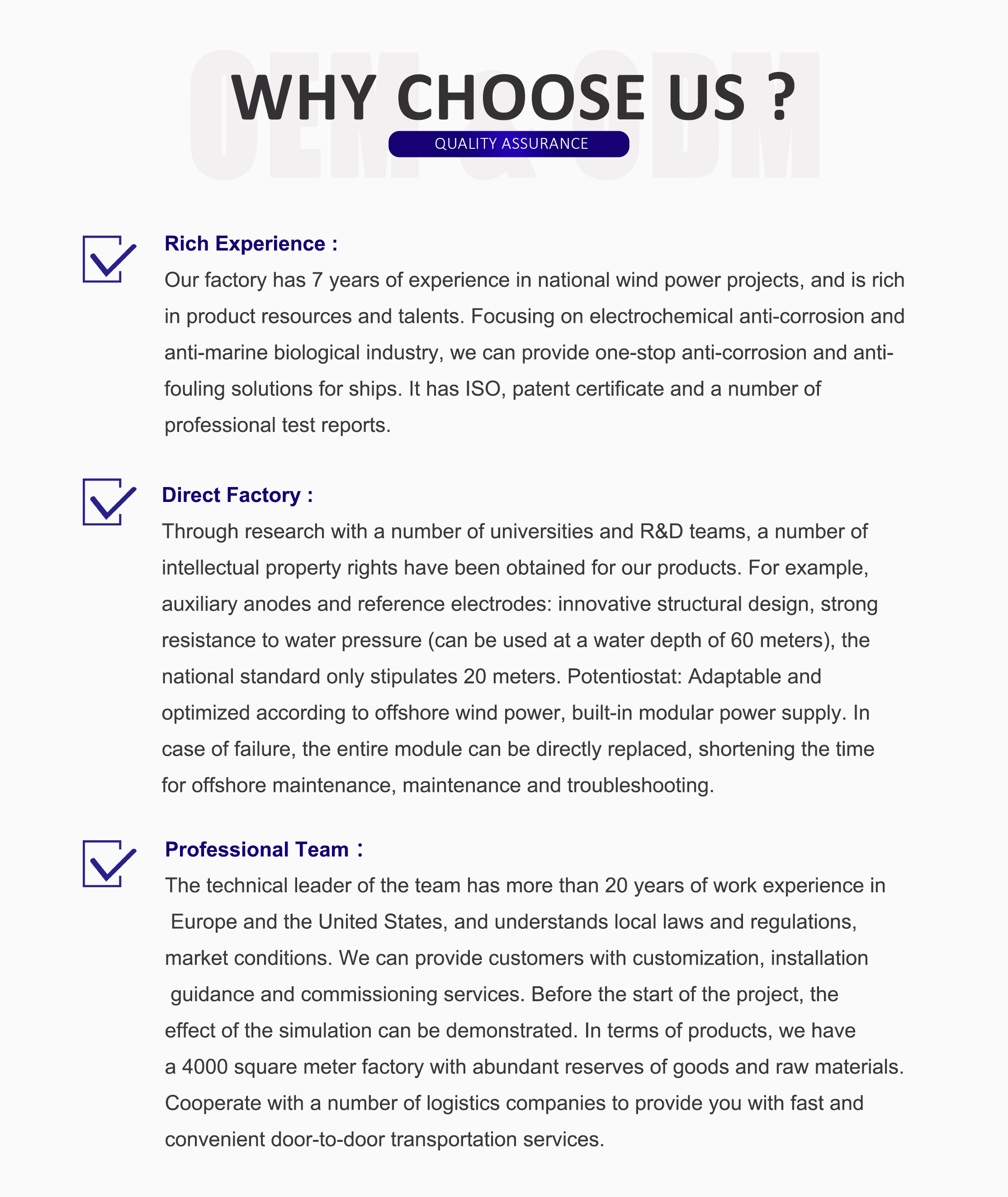 We focus on manufacturing and supplying cathodic protection products. Our offerings include sacrificial anodes, ICCP power supply units, MMO anodes, and reference electrodes for offshore structures and ships. We also develop anti-biofouling equipment and low-carbon cement-based composite technologies. Additionally, we offer consulting services in design, installation, maintenance, and monitoring of cathodic protection systems in many sectors like energy, transportation, and industry.